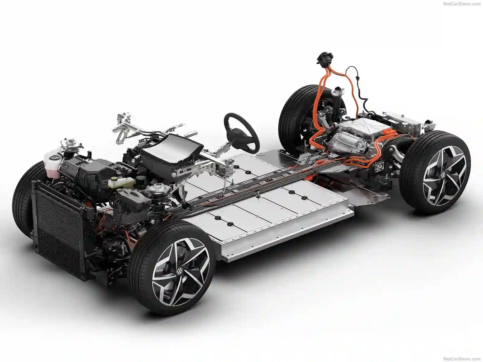 В современных электромобилях высоковольтная батарея размещена в пределах колёсной базы, а кроме того, ограничена по высоте силовой конструкцией днища, поэтому увеличивать её размеры некуда. На фото – “начинка” VW ID.3