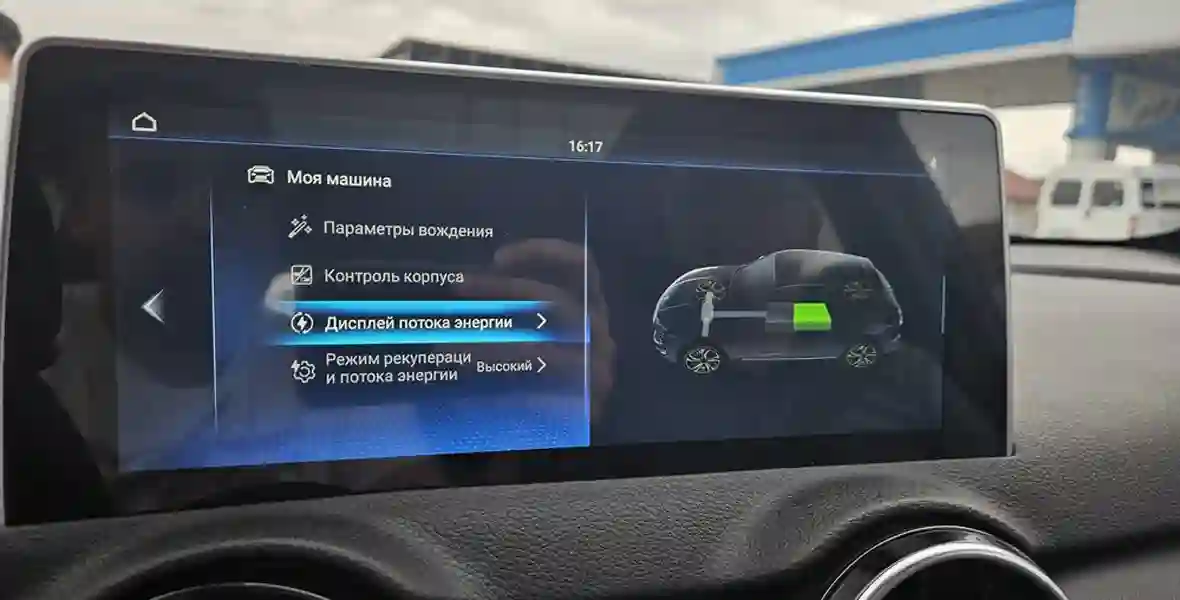 По паспорту батареи емкостью 53 кВт⋅ч должно хватить на 407 км. Полноценно замерить расход возможности не было, поскольку мы постоянно менялись автомобилями, а не ездили на одном. К примеру, один из наших отрезков пути на i‑JOY начинался с такими показаниями: заряд батареи в 67% и оставшийся запас хода в 270 км. Проехав сто километров по горным дорогам, уровень упал до 19%. Вывод тут прост. Как и с любой другой «электричкой», расход энергии будет зависеть от вашей манеры езды, скорости и погодных условий. Кстати, уже в следующем году i‑JOY планируют оснастить батареей увеличенной емкости, причем она будет российского производства.