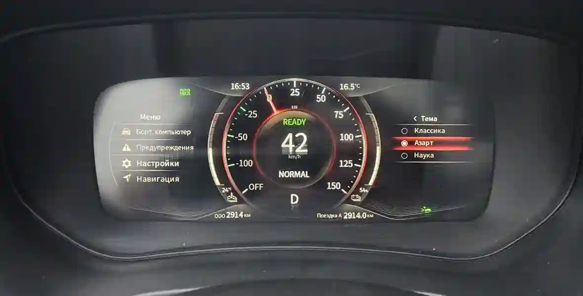 Вместо аналоговых приборов тут большой цифровой экран (10,25 дюйма), есть три темы оформления под названиями «Классика», «Азарт» и «Наука». В принципе все они выглядят неплохо, но только в «азартной» нет левого окошка, в котором мельтешат данные о расходе энергии.