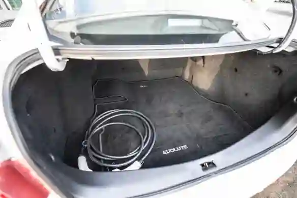 Багажник EVOLUTE i‑PRO очень вместительный и, кстати, глубокий. Фотографии с гитарой нет, но есть мое твердое обещание, что две-три гитары влезло бы безо всяких усилий! А пока здесь лежат провода для зарядки, которые заряжают автомобиль от обычной 220-вольтовой розетки примерно за восемь часов. Это ли не прекрасно?