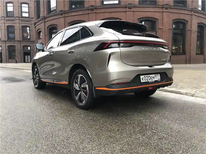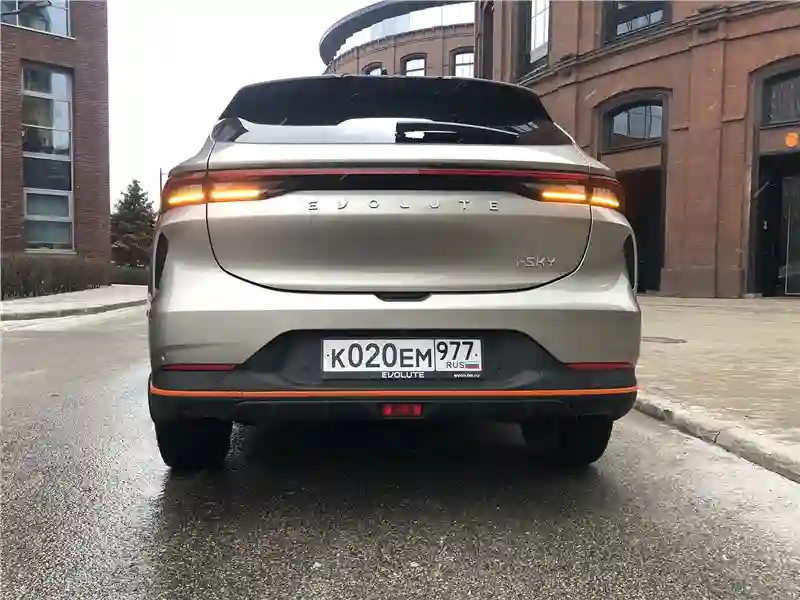 Внешность у EVOLUTE i‑SKY футуристическая, но не вычурная. Длина – 4565 мм, ширина 1860 мм, высота 1680 мм. Колёсная база 2715 мм, клиренс 175 мм. Кросс-купейного типа кузов, огромные светодиодные полумесяцы передней светотехники, массивная горизонтальная «штанга» задней, во всю ширину кузова. Изящная волна выштамповки по всей боковине кузова от носа до кормы, с повышением в конце. Оранжевые молдинги каймой идут по пластиковому обвесу кузова. Вид спереди – на любителя, сзади – твёрдая четверка, профиль навевает воспоминания, например, об Audi Q5, в общем, за экстерьер – четвёрка с плюсом как минимум.