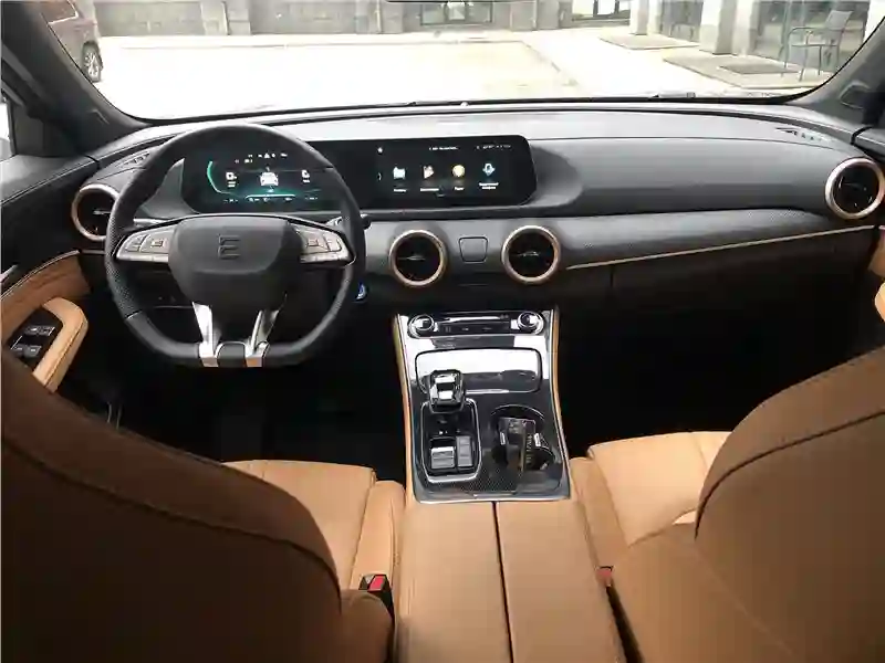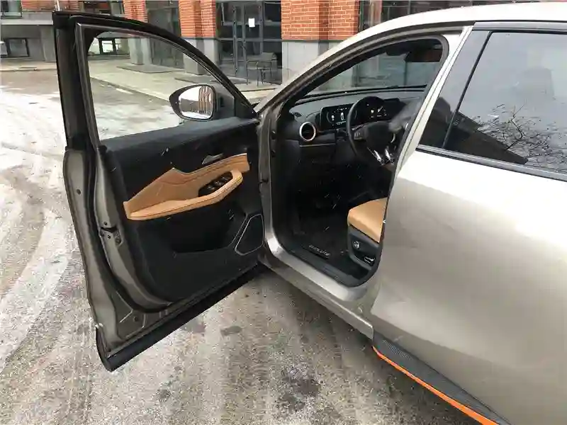 В салоне тестовой машины – сочетание кожзама абрикосового цвета и темного пластика с вставками под алюминий. Материалы недорогие, но благодаря грамотному цветовому сочетанию выглядят дорого. Два одинаковых по размеру экрана, 10,25-дюймовых – приборная панель и экран мультимедиа в центре передней панели. Есть Bluetooth, нет CarPlay и Android Auto, но можно «зеркалить» экран смартфона через приложение Carbitlink. Немного странно смотрится панорамная крыша c эффектом «звездное небо» – днем, когда солнцезащитная шторка открыта. Кажется, к стеклу крыши снаружи прилипло что-то, вроде звездочек от детской хлопушки.