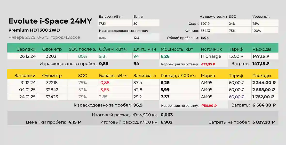 А поскольку прогноз погоды на весь период тестирования не обещал заморозков крепче -5-10°С мы придумали для EVOLUTE i‑SPACE новую программу испытаний: поставим этот гибрид в равные с обычной бензиновой машиной условия и будем всё время эксплуатировать его только на топливе, без дозарядок. А там посмотрим, сколько сэкономит батарейная модель. Если вообще сэкономит.
